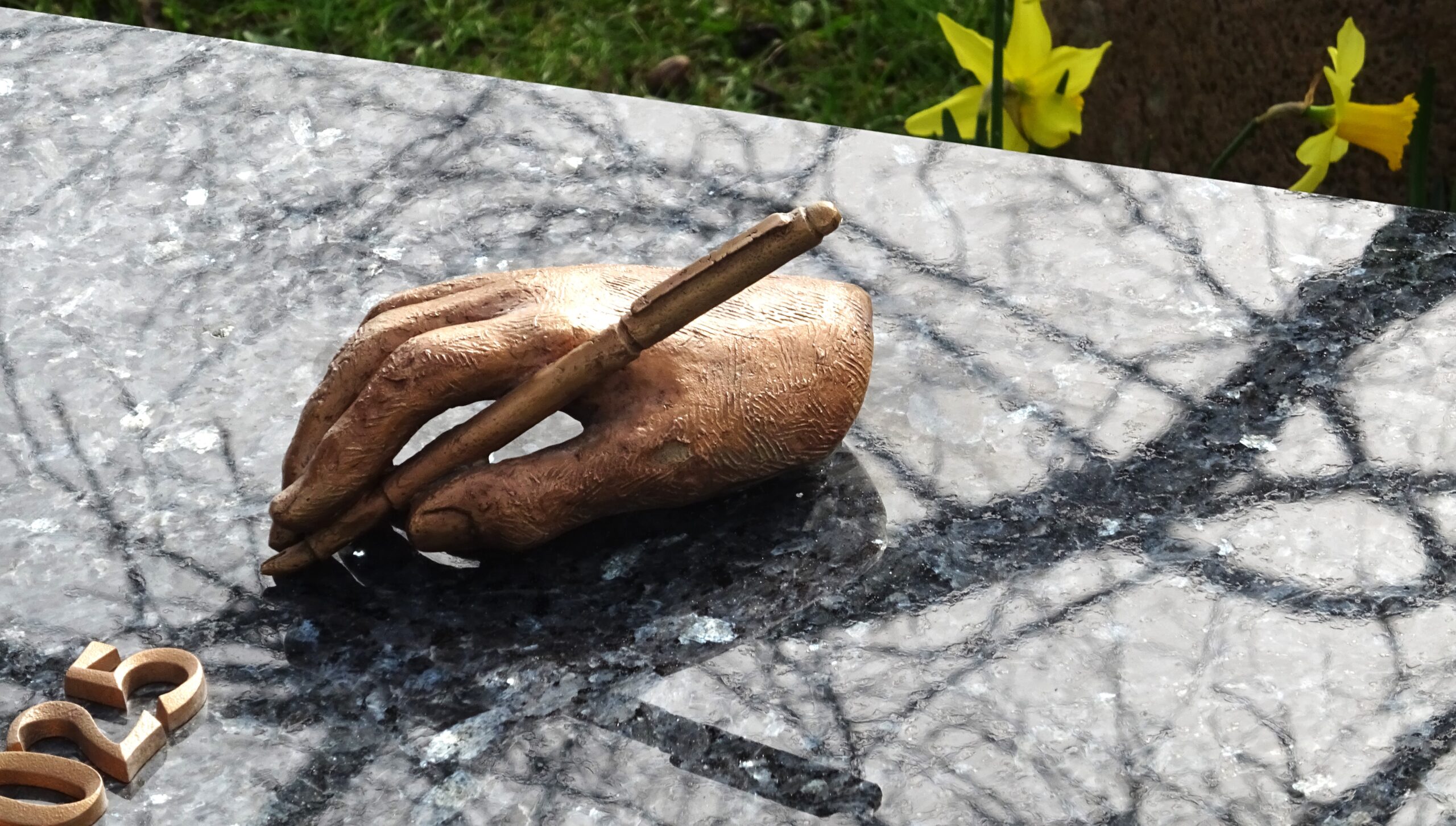 Hand van columnist met vulpen in brons, 20 x15 cm op grafsteen.